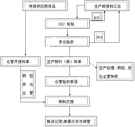 4、供應商所送物料為誤送,超送或其他原因,經(jīng)物控、采購、總經(jīng)理協(xié)商簽名后,辦理退貨手續(xù)。此類退料不計入財務核算范圍。