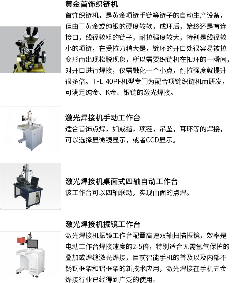 通發(fā)激光研發(fā)針配合黃金織鏈機(jī)、K金制鏈機(jī)、首飾制鏈機(jī)的TFL-80PF自動激光焊接機(jī),焊接機(jī)采用能量反饋技術(shù),光點穩(wěn)定,能量強(qiáng)勁,實現(xiàn)一環(huán)一焊的功能,確保金鏈的耐拉強(qiáng)度。本激光焊機(jī)實現(xiàn)了水冷一體的小型化結(jié)構(gòu)。適用于各種生產(chǎn)場所。