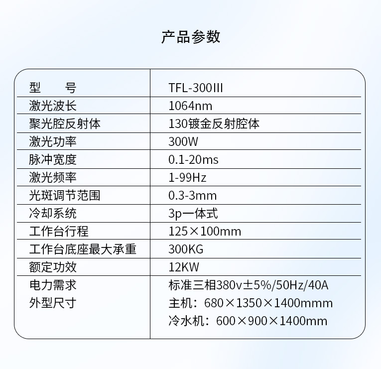 TFL-300Ⅲ型模具激光焊機(jī)是通發(fā)激光公司自主研發(fā)的一款大功率激光焊接機(jī),采用通發(fā)自主研發(fā)的二代精密雙燈電源為燈泵浦驅(qū)動電源,配置觸摸屏,操作更方便。主機(jī)具備激光頭手搖升降與工作臺按鈕電動升降實(shí)現(xiàn)焊接不同厚度模具的激光焊加工。本款機(jī)型更適用于各類大功率、大面積激光修補(bǔ)的模具。由于激光功率大,同時可激光焊接鈹銅模具,鋁材模具或鋁材零件。在大面積激光修補(bǔ)模具時,可以使用更粗的焊絲,激光焊接效率大幅提升。