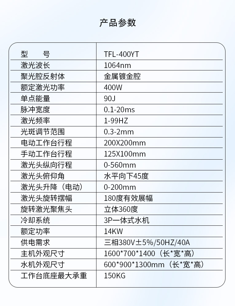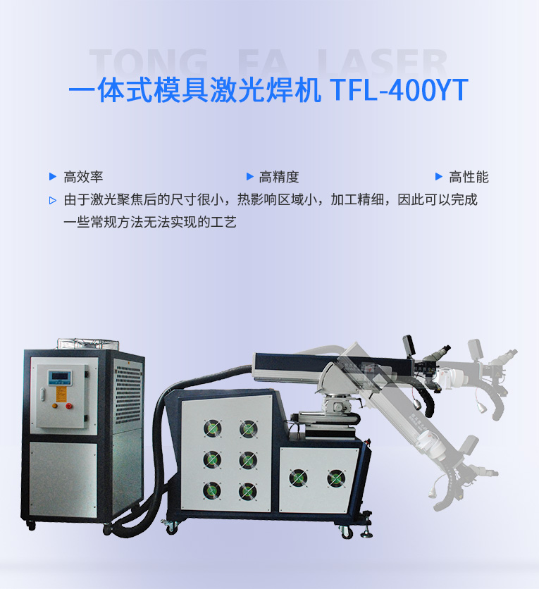 通發(fā)激光一體式模具激光焊機(jī)TFL-400YT是一款多種功能融合一體的新型模具激光焊接機(jī),針對特大型塑料模具激光焊、中型注塑模具激光燒焊、小型塑膠模具激光補(bǔ)焊、壓鑄模激光補(bǔ)焊具等各類模具可實現(xiàn)超精密修復(fù),幫您解決大型汽車模具修復(fù)難題,不需要模具移動,電動工作臺與立體旋轉(zhuǎn)激光頭完美結(jié)合,操作桿控制運(yùn)動移動實現(xiàn)輕松激光修復(fù)大型模具,同時也保留了傳統(tǒng)手動工作臺超精密修復(fù)模具功能。